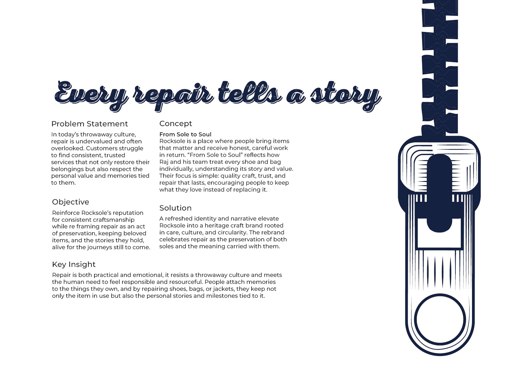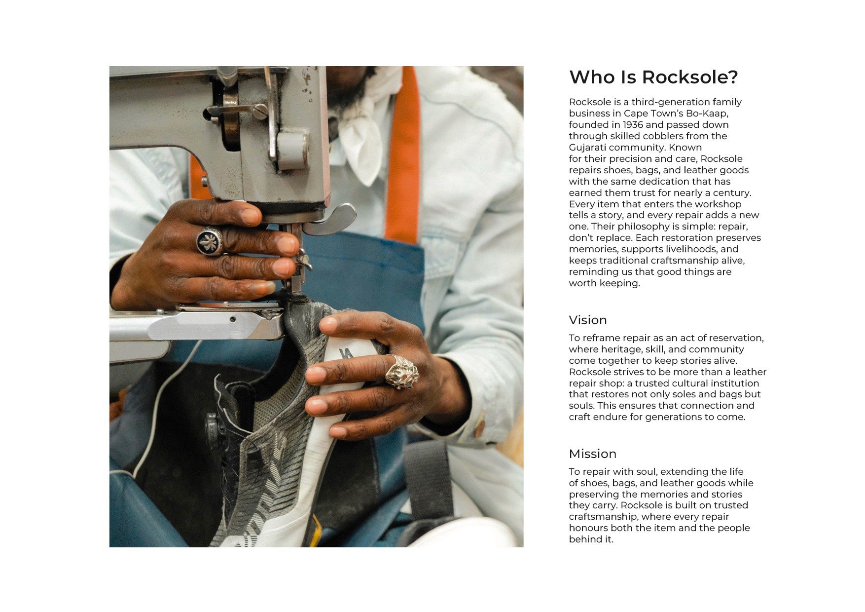 The brief, From Concept to Client: Positioning Yourself Through Purpose Driven Design, challenged me to create a self directed project that reflects my values, strengths, and design identity through real world impact. Rather than branding myself directly, the aim was to let my creative voice and purpose emerge through the way I research, strategise, and design. I chose to respond to this through Rocksole – From Sole to Soul, a rebrand of a small family run cobbler workshop in Bo-Kaap. The project explores how design can preserve craft, heritage, and sustainability, aligning with my belief that meaningful communication design has the power to protect stories and strengthen communities. Over seven weeks, I developed the project from research to execution, using strategy, empathy, and storytelling to position Rocksole for a more connected future, and in the process, define who I am as a purpose driven designer.