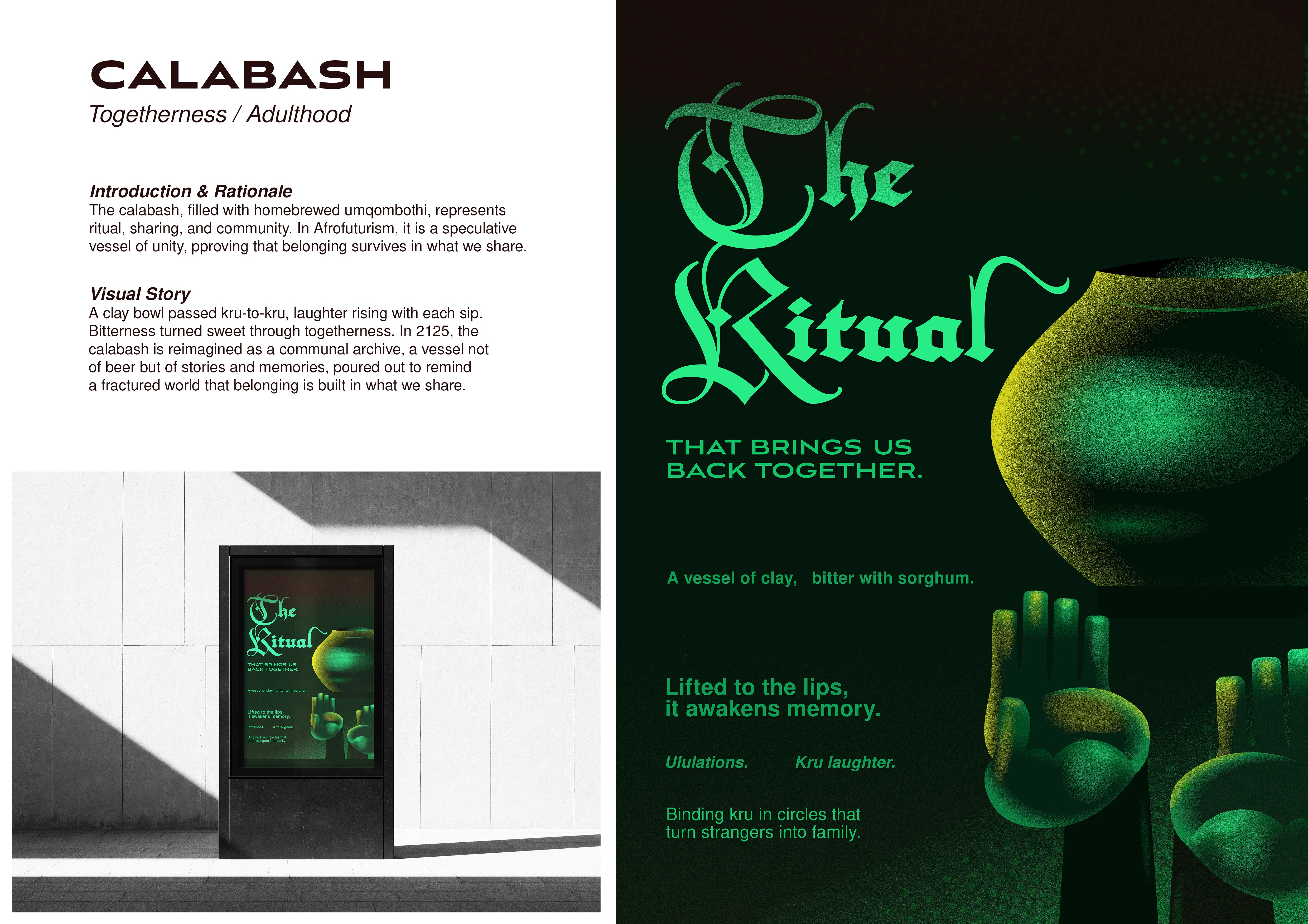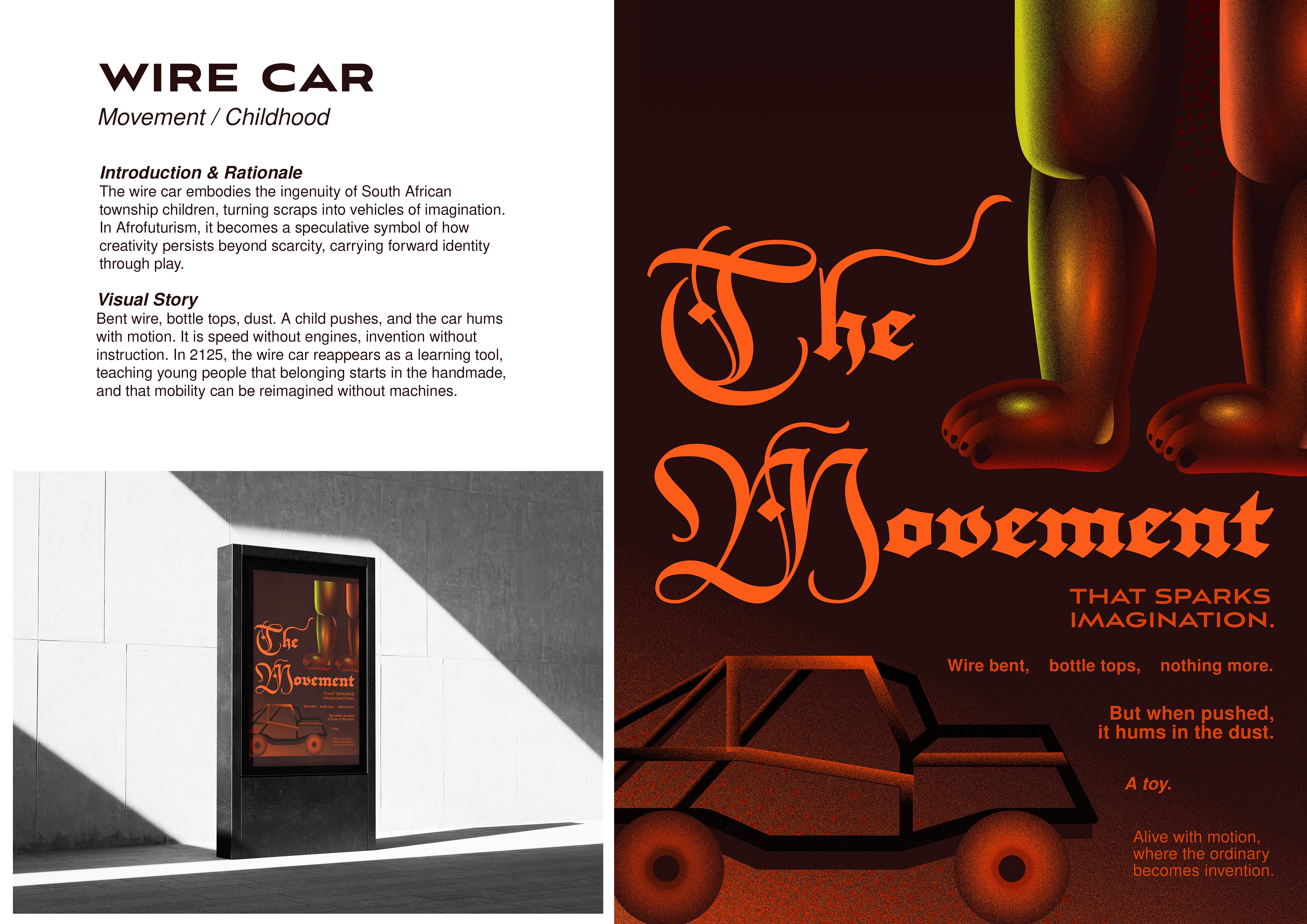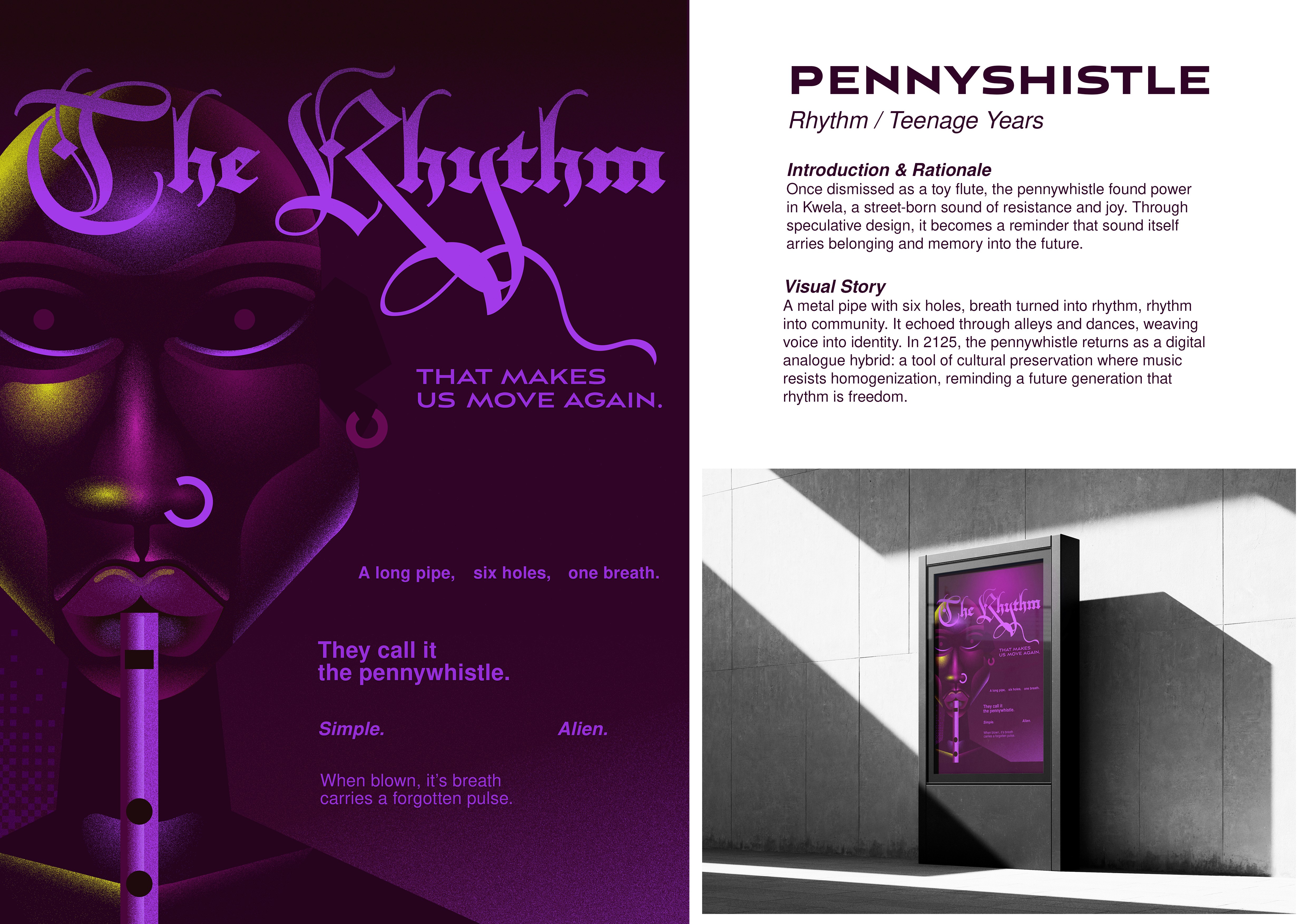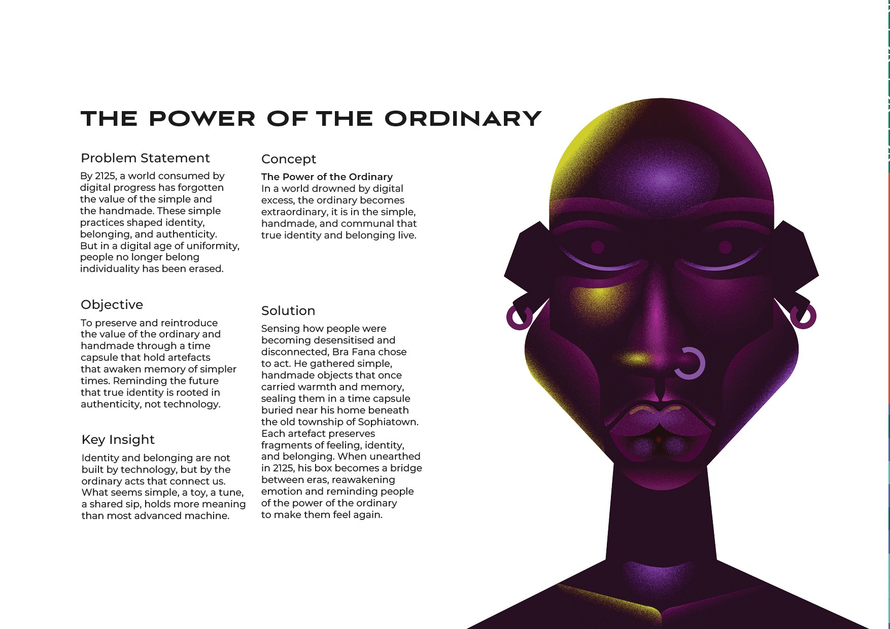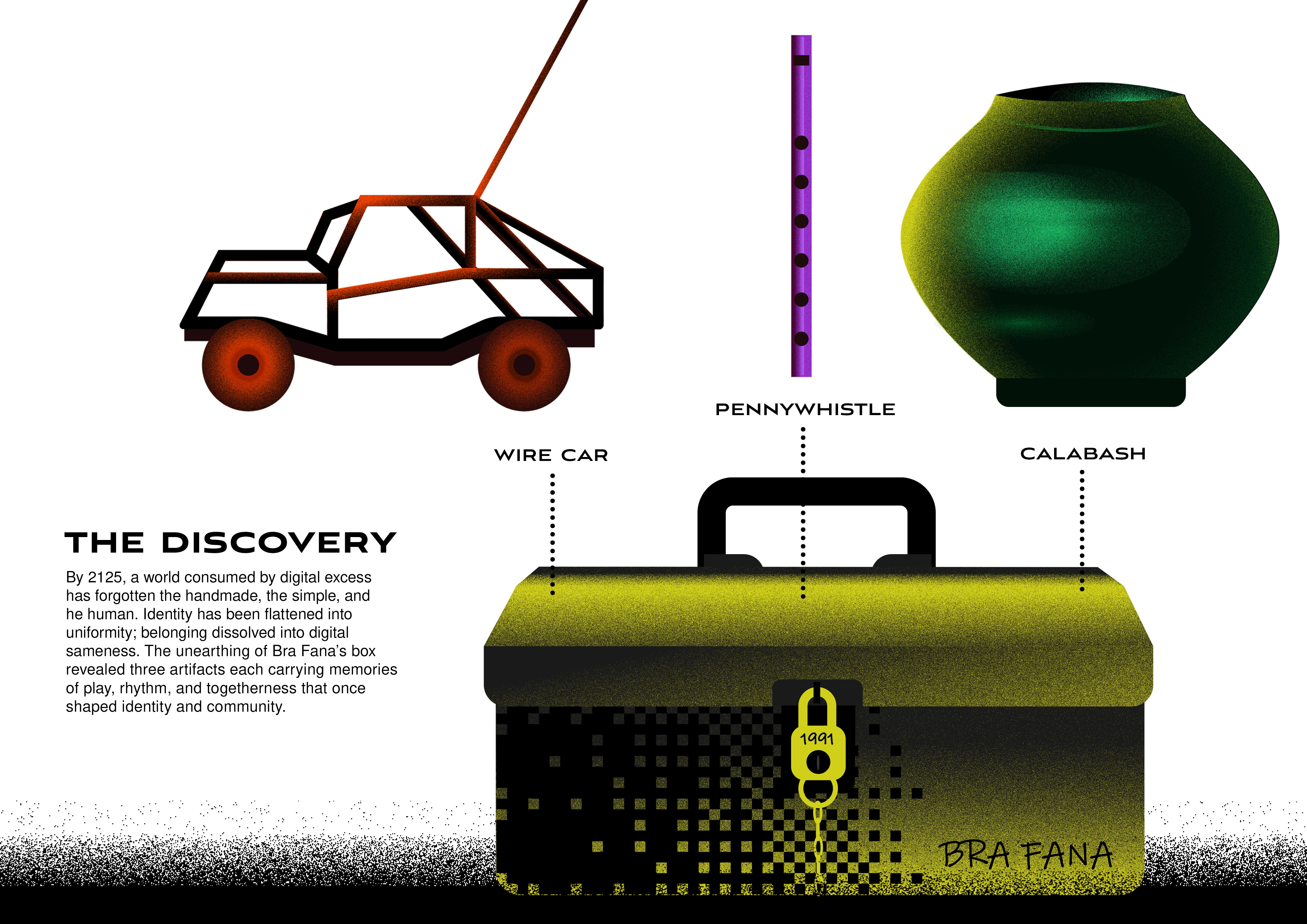 The brief challenged us to imagine South Africa one hundred years from now, in the year 2125, through the lens of Afrofuturism and Speculative Design. We were asked to design three artefacts from this imagined future, each serving as evidence of how society, culture, and technology might evolve. The goal was not to predict the future, but to provoke thought about the kind of future we want to create. Each artefact needed to align with a personal cause and tell a speculative story that feels both imaginative and grounded in reality, a “time capsule” carrying lessons, warnings, and hopes from tomorrow. My project envisions a world where technology has replaced touch, emotion, and culture. In this digital, impersonal age, connection has become data and identity has become code. Yet, when a time capsule from old Sophiatown is unearthed, it sparks a return to simpler times and a longing to feel again, to remember what it means to be human.